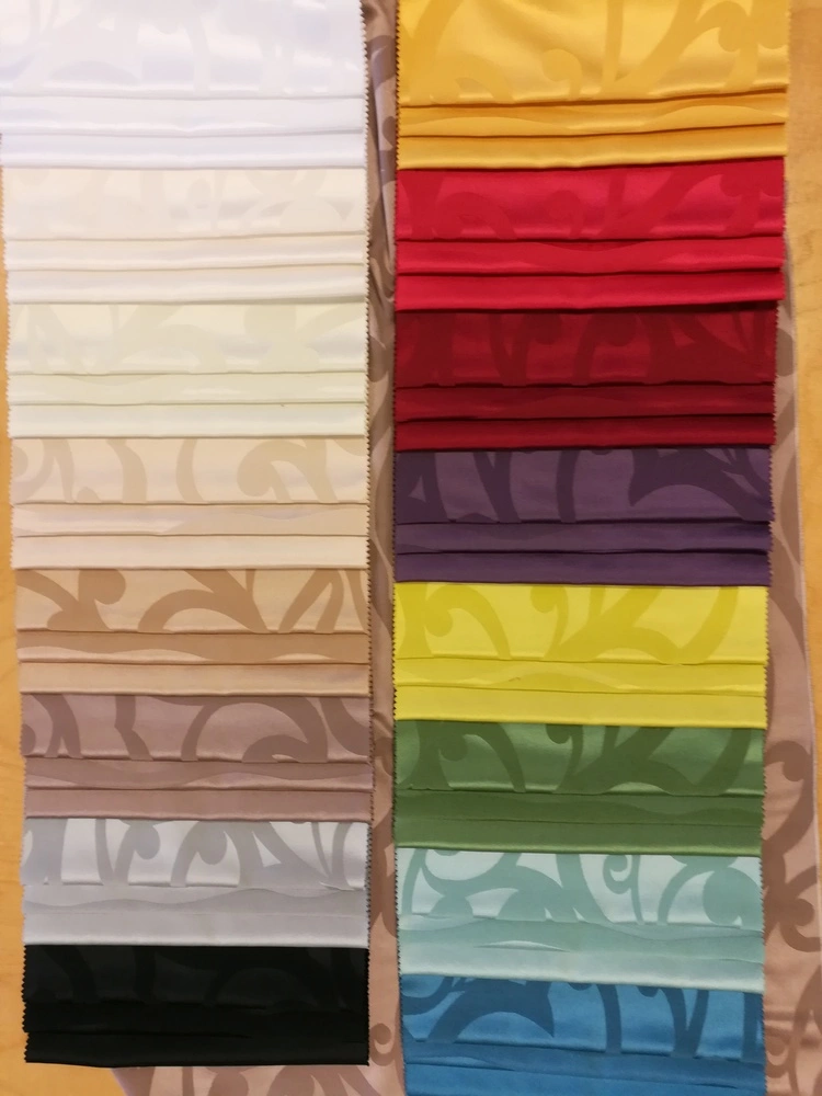 Z těchto látek různých barev (dle vzorníku na obrázku) můžeme zhotovit přehozy přez postel, závěsy, rolety, panelové japonské stěny, mašle, věnce a další dekorace...
