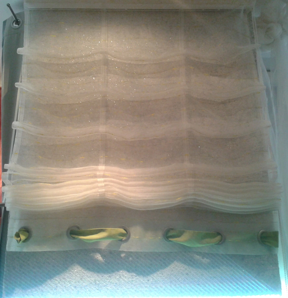 Originální římská roleta šíře 96 cm a výška 280 cm z organzy navodí měkký a útulný pocit v interiéru. Dole je zdobená dekokroužky s barevnou stuhou, kterou lze měnit podle nálady, ročního období nebo přispůsobit barevnosti interiéru