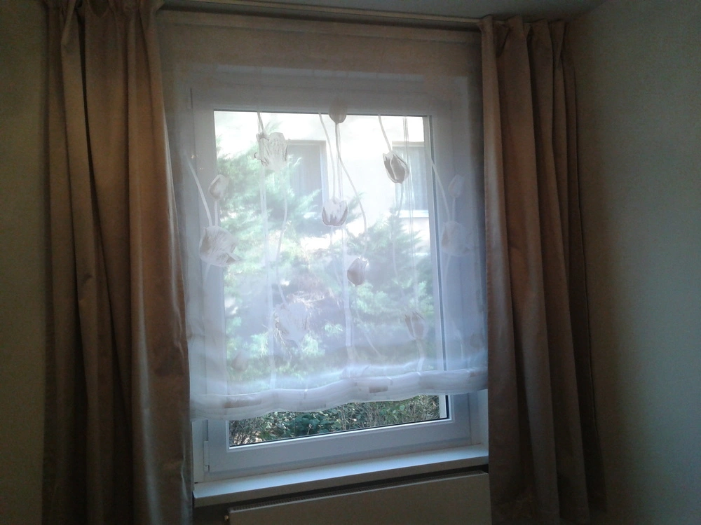 Poloprůsvitný materiál v bílé barvě s tulipány navazuje na přírodní a účelné vybavení interiéru . Zvolená barevnost příjemně změkčuje přísun světla zvenčí a při úplném spuštění navozuje pocit soukromí. Zároveň ale prostor opticky nezmenšuje, působí vzdušně a čistě. Praktický systém vytahování římské rolety nahoru zabruňuje zašpinění římské rolety (např.při práci v kuchyni).