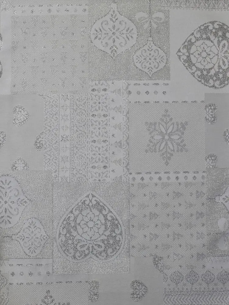Žakárová vazba sříbrno-bílé látky s texturou přináší do interierů zcela nový, moderní rozměr. Látka je pevná, odolná proti rychlému opotřebení a dobře drží tvar při výrobě dekorací ( stuhy, věnce,.. )